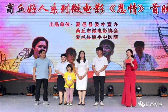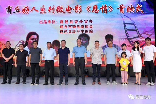 6月14日,夏邑县委外宣办、商丘微电影协会导演学会、夏邑康平中医院联合打造的微电影《恩情》,在夏邑县文化馆小剧场举行首映式。中共夏邑县委县委宣传部常务副部长王松涛、县委外宣办主任苗育才、县文明委办公室主任张君见、县总工会常务副主席孙朝鲜、县卫健委副主任郇团结、县红十字会常务副会长冯景西、县新闻出版和电影管理科科长顾长雨、县文化馆馆长何四海和影片《恩情》编剧、导演李双军、演员张淑珍、张默然、张雅晴等出席首映式。