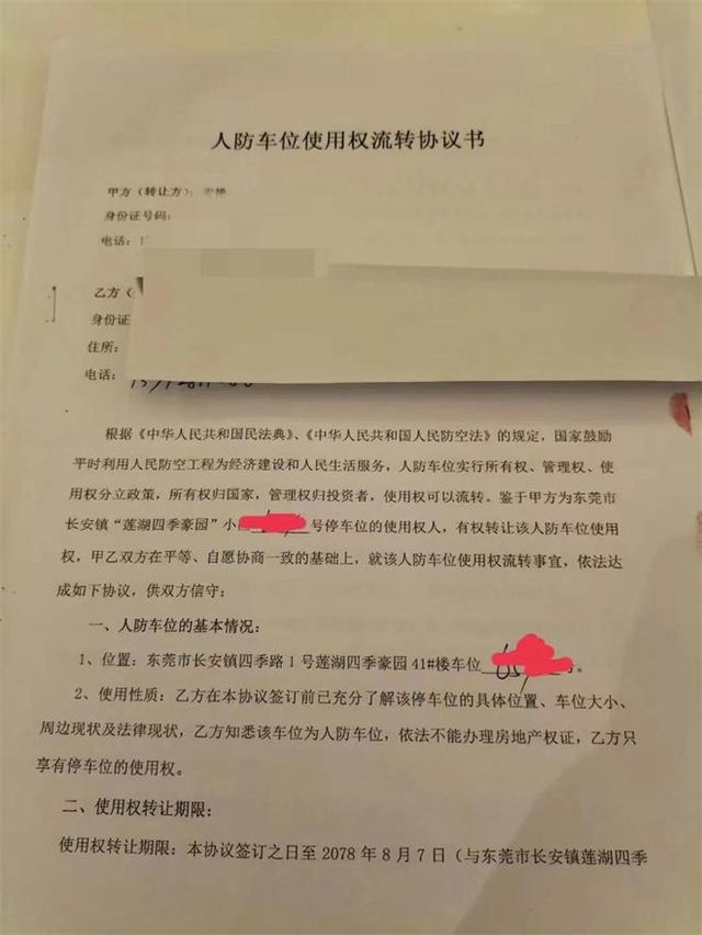 不过,今年4月底,小区出现一件令业主非常气愤的事,小区物业发出通知说,从今年5月开始,人防车位月租或者临租取消,原因是这些人防车位已经以使用权流转的名义,又一次被变相“卖”了,而从业主提供的几份人防车位使用权流转协议书看到,人防车位的使用权从约6个人手中转让给了包括小区业主在内的其他人,转让价高达45万一个,而转让期限则至2078年,转让时间高达56年。