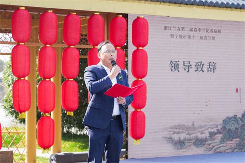 海曙区古林镇党委书记王光阳在致辞中首先向长期支持兰花产业发展的社会各界人士表示衷心的感谢;接着他说古林镇地处宁波市海曙区区域中心,2023年GDP超200亿元。兰花作为繁荣乡村产业、助力乡村振兴、农民增收致富的重要资源,我们积极引进建设宋韵兰园,持续举办兰花名品展,开设“木问草堂”共富工坊,引导扶持村民种植兰花,全力发展兰花特色产业集群,陆续落地实施“三院一馆一园区”的项目规划,分别是:兰花研究院、兰文化书画院、兰花学院、兰文化博物馆和兰花产业园。并且在镇第17届人民代表大会第5次会议上,兰花被确定为古林镇镇花。我们由衷期盼以本次兰展为契机,共同推动兰花产业更加兴盛,兰花影响更加深远,开启古林“以兰为媒”促乡村振兴、共同富裕的新征程。