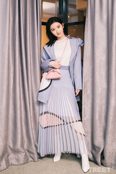 景甜身着Akris 2019春夏系列艺术印花套装搭配粉色Micro Ai Bag,清新色彩间尽显甜美气质。
