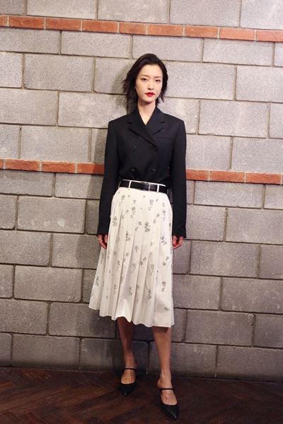 杜鹃身着Prada 2019早秋系列黑色西装搭配白色水晶刺绣半裙,优雅随性。