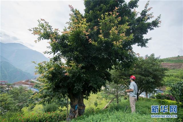 工作人员在白鹤滩水电站植物园查看古树生长状况(7月11日摄)。 新华社记者 胡超 摄