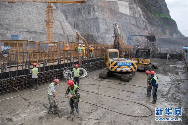 施工人员在白鹤滩水电站建设工地进行大坝混凝土振捣(7月11日摄)。新华社记者 胡超 摄