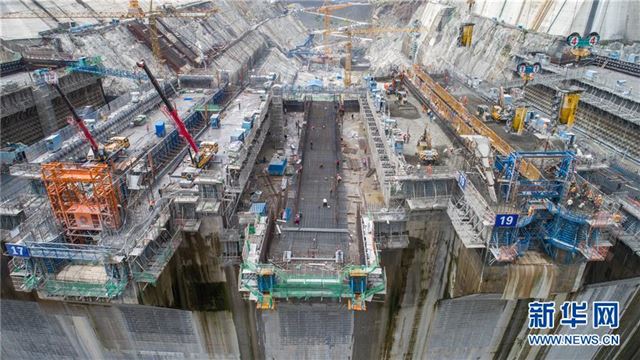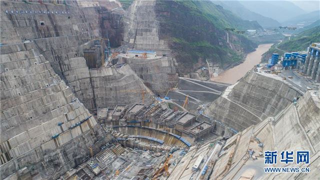 这是白鹤滩水电站建设工地(7月11日无人机拍摄)。 新华社记者 胡超 摄