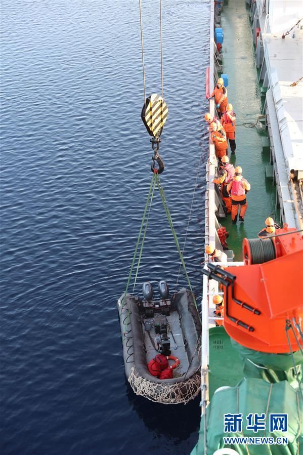 8月1日,北极科考队队员从“雪龙”号科考船上放出橡皮艇,准备乘坐橡皮艇回收锚碇式潜标。 新华社记者申铖摄