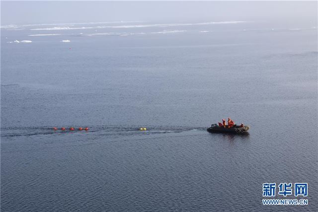 8月1日,北极科考队队员乘坐橡皮艇回收锚碇式潜标。 新华社记者申铖摄