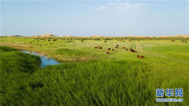 内蒙古杭锦旗在黄河凌汛期向沙漠引水,让水患变水利,沙地变湿地,库布其沙漠北缘显现出“水沙共存”美景(8月1日无人机拍摄)。