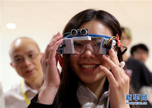 8月8日,参加设计展的学生在展示为视障人士研发的具有导盲功能的眼镜控制系统。