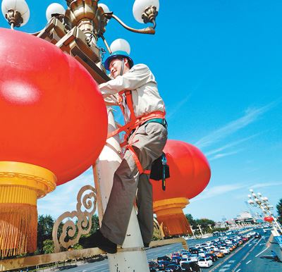 8月21日,北京市城市照明管理中心华灯班的工人正在长安街上调试新安装的大红灯笼。本报记者 贺 勇摄