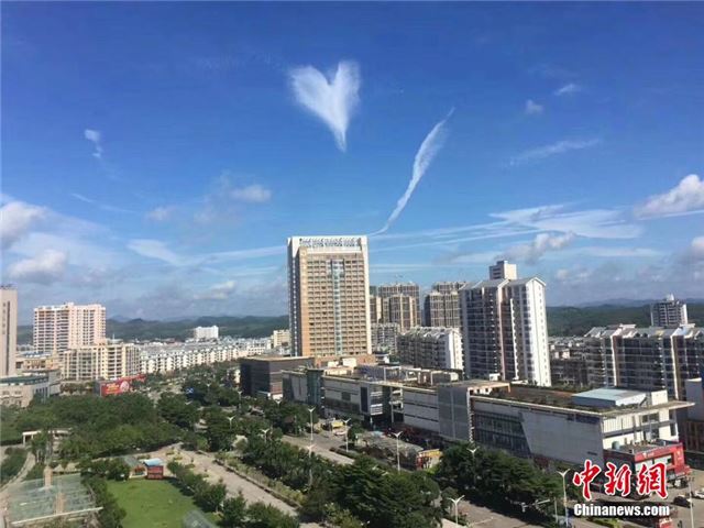9月5日,广西钦州市天空中出现一团巨大的心形云,有网友笑称,比心,天空都恋爱了,连云朵都是爱你的形状。这朵“爱心云”出现后,刷爆了当地网友的朋友圈。 陈燕 摄