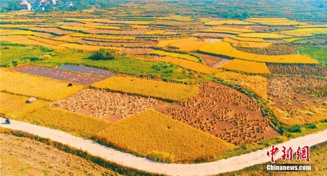 10月6日,金秋十月,在江西省泰和县万合镇陂溪村金色田野上,农民在收割水稻。这里属丘陵山坡地貌,耕地多为梯田,错落有致,丘丘相接,块块相连,形状各异,美不胜收。由于梯田机耕机收不方便,这里的农民都是采用人工原始的办法收割水稻。邓和平 摄