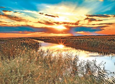 原标题:湿地霞光穿云来