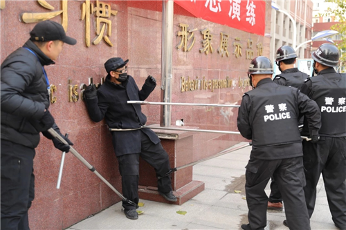演练现场,一名蒙面“歹徒”手持凶器翻门闯入学校北院,门卫值班人员看到此情况,立即报警,并向学校领导报告。学校立即启动了应急预案,学校保安、护校队员紧急行动,临危不乱,手持钢叉、警棍等器械,将“歹徒”围住,与“歹徒”交涉、周旋,学生在老师们组织下迅速躲避。快速赶到的民警同保安合力,很快将“歹徒”制服并押上警车。