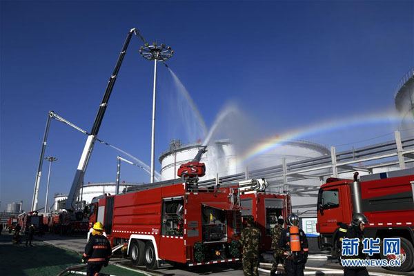 12月12日,消防队员对模拟事故现场进行喷水冷却处理。 当日,山东省危险化学品事故综合应急演练在淄博举行,以强化政府部门和企业协同防范和应对重特大灾害事故应急能力。 新华社记者 范长国 摄