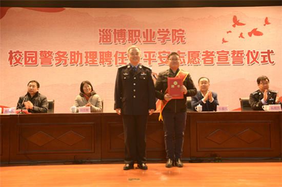 活动中,宣读了《淄博职业学院实施校园警务助理和平安志愿者实施意见》和《关于聘任杜平、李琳为淄博职业学院法制辅导员的决定》,杨百梅为周村公安分局学苑派出所的两位民警颁发了法制辅导员聘书;张国华为淄博职业学院18个系院的代表颁发了校园警务助理聘书;张爱民为平安志愿者队伍授旗;平安志愿者集体进行了宣誓;高明伟和高爱国分别代表周村公安分局和淄博职业学院发表了热情洋溢的讲话。