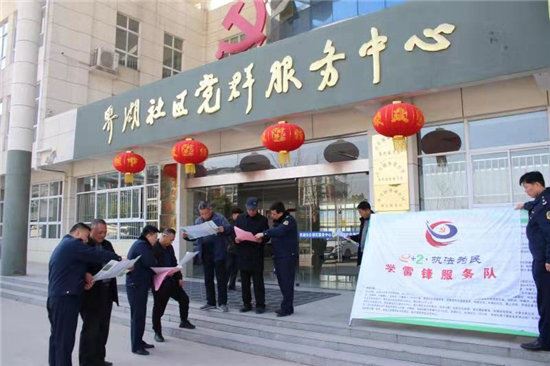 3月12日8时30月12日8时30分,大队党支部与社区携手在“e+2·执法为民”党建标识前,讲解“以案说法”宣传册上不同类型严重违法案例,解释案件类型识别要点,分违法种类、危害情节介绍典型案例特征、共性以及处罚依据、警示等。