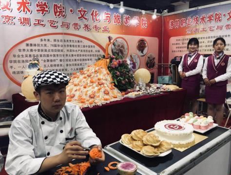 普通蔬菜白萝卜、红萝卜、心里美、南瓜、黄瓜……,经过“食品雕刻艺术社”师生的精心创作、仔细雕琢;打造成栩栩如生“孔雀开屏”站台,给产业博览会增色添彩,吸引了无数参观者好奇的眼球,赢得了大会组委会评委的广泛称赞,征服了现场观众,荣膺“孔雀开屏”制作金奖和大学生“食品雕刻艺术”展台“创新奖”。在“剪纸艺术社”团队学生们灵巧的手中,五色彩纸华丽转身为“花开富贵”、“我的祖国”等精美剪纸艺术品,引得观众争相体验,传承了传统剪纸文化艺术,获展会组委会颁发的“剪纸文化技艺”金奖殊荣。