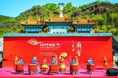 开幕式上,威风锣鼓、龙狮表演、秧歌花会、百人太极等传统表演汇聚一堂,这是丫髻山清代皇家祈福仪式。