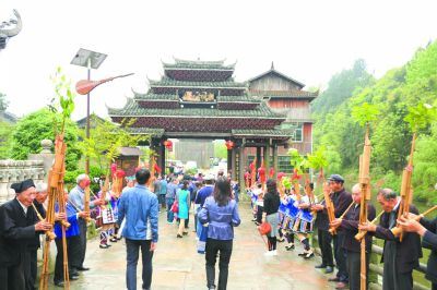 湖南通道县坪坦侗寨前,村民们吹起芦笙欢迎远方的客人。 贾 艳 摄