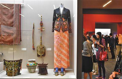 展览中还有一些现当代展品,展示了地区独特文化。一件来自马来西亚的娘惹服(可芭雅服),展示了这种土生华人(峇峇娘惹)所穿的服饰,通常绣有金鱼、海浪和玫瑰花图案,能凸显年轻人身材,故年轻人常穿着此类服装。缅甸则带来了一件当代竖琴,竖琴被称为弦乐器之王,曾在缅甸骠国时代(公元前2世纪-公元10世纪)被广泛使用。
