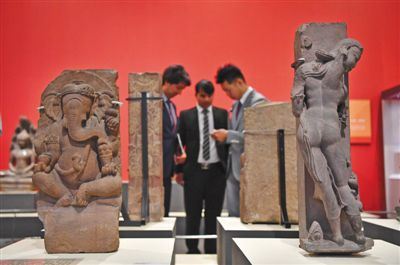 5月13日,“大美亚细亚——亚洲文明展”在国家博物馆开幕,观众欣赏象头神伽内什坐像等印度石雕。摄影 李木易