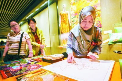 马来西亚的蜡染设计师努尔·沙依巴赫·赛义德和她的搭档现场展示了壁布的制作过程,这个被马来西亚艺术家称为“Batik”的非遗手艺,与中国的蜡染工艺类似。用蜂蜡滴灌在染布之上勾勒出美丽的纹络,风干后即可上色,蜡液形成的纹络像一面面墙,将不同色彩区隔开来,制作成色彩斑斓的壁布。最让人赞美不绝的就是蜡染的冰纹。冰纹的形成,是蜡画胚布在不断的翻卷浸染中,蜡迹破裂,染液便随着裂缝浸透在白布上,留下了人工难以摹绘的天然花纹,展现出清新自然的美感。