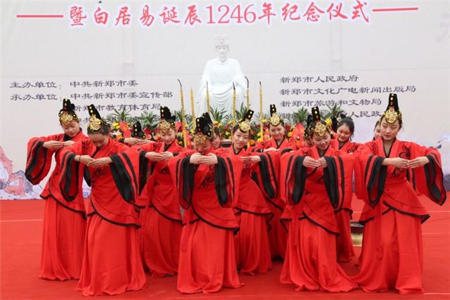 仪式现场,到场的领导、学者和嘉宾通过敬献花篮、敬献高香、敬献美酒等方式缅怀白居易,并用配乐诗朗诵《溱与洧》《忆江南》等、古乐演奏吟唱《宿荥阳》、乐舞敬拜等诗乐方式向白居易在诗词方面的成就致敬。