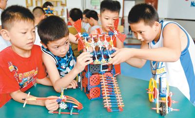 7月15日,孩子们在河北南和县青少年活动中心兴趣特色班进行手工创意搭建。暑假期间,丰富多彩的特色兴趣班让学生们体验到书本外的精彩。