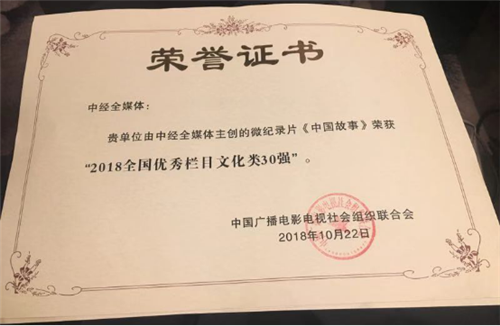11月21日,在中国广播电影电视社会组织联合会(简称“中广联合会”)主办的“全国优秀栏目、创意活动、短视频评析活动”中,中经全媒体选送的百集微纪录片栏目《中国故事》被评为“2018年全国优秀栏目”。