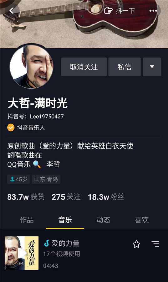 本网讯(记者:刘连胜)2020年4月14日报道:在当前最火的平台抖音里,有一位昵称“大哲—满时光”的歌手,他叫李哲,1975年4月27出生,朝鲜族牡丹江人。从小就对音乐有着浓厚的兴趣,曾组过乐队,一直梦想唱遍全中国。目前在青岛以直播的方式唱行全中国,近日一首原创歌曲歌颂中国医务英雄们的歌《爱的力量》成功录制发布,作词柴鹏宇,作曲李雄杰。