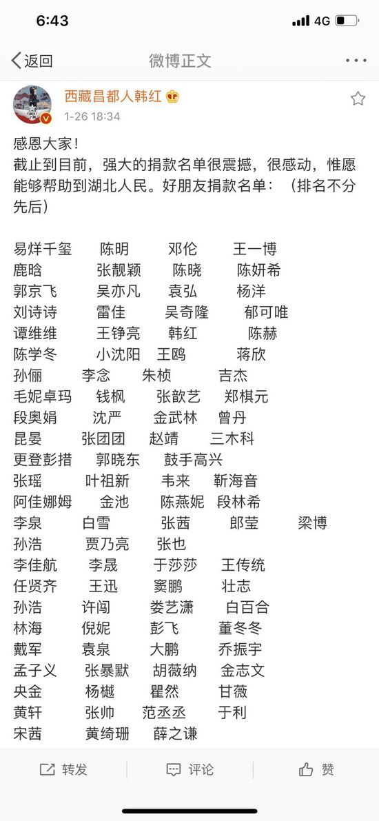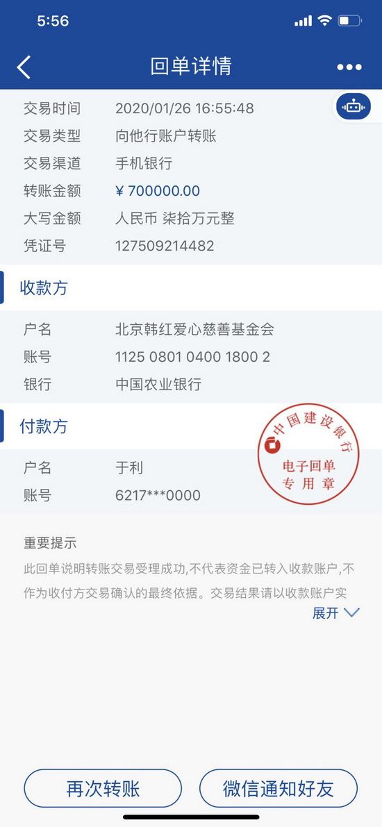 此次捐款落户于北京韩红爱心慈善基金会,韩红老师第一时间发文感谢各位朋友的捐款:很感动,惟愿能够帮助到湖北人民。于利先生微博表示:2020年是沉重的一年,新冠肺炎疫情的突发和扩散不可避免地对整个社会造成了沉重的影响。一场与病毒抗衡的战役打响,许多白衣天使逆流而行,勇敢坚守,是他(她)们的义无反顾,让患者重燃希望!希望和韩红老师一起帮助需要帮助的同胞,出一份力量,向白衣天使致敬,武汉加油!