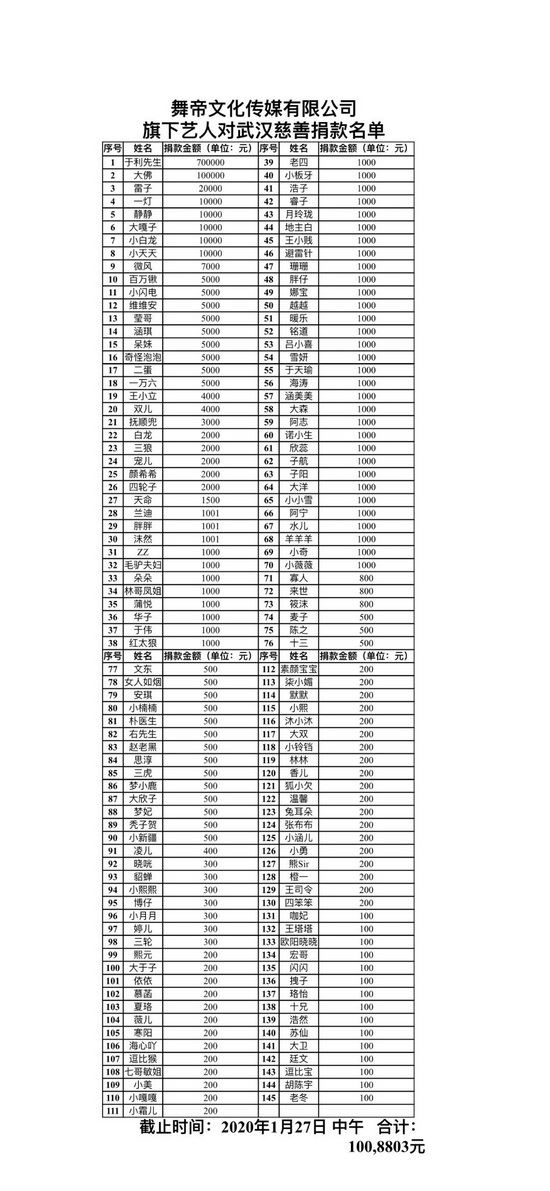 2020伊始,武汉的疫情爆发之后,牵动了全国人民的心,于利先生率先力行,1月26日下午四点,通过北京韩红爱心慈善基金会向武汉灾区捐赠善款70万人民币,主要用于全国范围内疫情发生的重点地区的防护措施和保障,用于抗击疫情的物资等相关支持,并且积极号召舞帝旗下主播尽其所能为疫区献爱心,回报社会!截止2020年1月27日19点,舞帝传媒捐善款合计人民币1012003.00元。