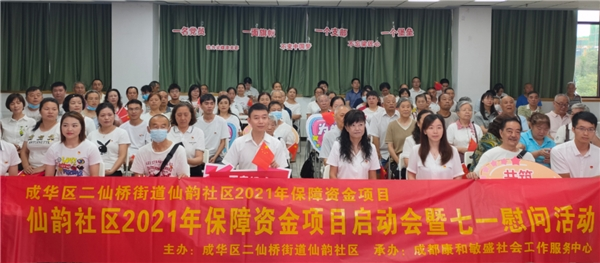 党旗如画,展现百年光辉历程;岁月如歌,颂唱大党丰功伟绩。为隆重纪念中国共产党成立100周年,2021年7月1日上午7点半,在成华区孵化园3楼,仙韵社区党员们已经整齐的坐在会场,等待观看庆祝中国共产党成立100周年的现场直播。同时进行的还有二仙桥街道仙韵社区庆祝中国共产党成立100周年暨“七一”表彰大会、社区保障资金项目启动仪式。本次活动由成华区二仙桥街道仙韵社区党委主办,成都康和敏盛社会工作服务中心承办,成都市金牛区社会组织促进会,成都市菁彩社会工作服务中心协办。