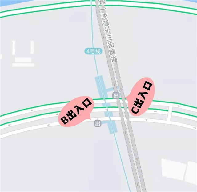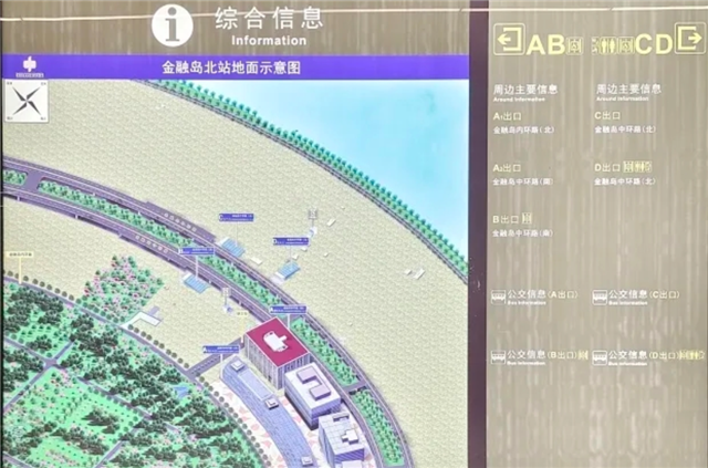 金融岛北站位于金融岛中环路与银贝街交叉口,现启用B、C两个出入口。