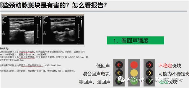第一,斑块回声强度:如果报告低回声斑块,这样的斑块是不稳定斑块,容易脱落,形成脑梗死。它就像红绿灯里面的红灯一样,是比较危险的斑块;如果报告是等回声和强回声斑块,这样的斑块是稳定斑块,它就像绿灯,是相对安全的斑块;另外还有混合回声,这样的斑块可能为不稳定斑块,也需要高度警惕。