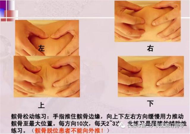 髌骨松动训练(在经医生许可的情况下):从上下左右四个方向做轻柔、缓慢的推髌骨治疗,范围要充分,初期以两侧推动为主。推动过程中不产生任何疼痛且推动方式不可影响骨折愈合。