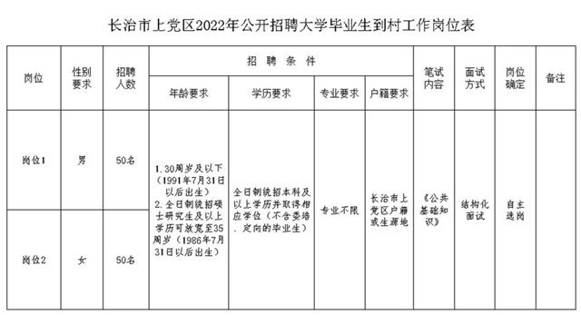 一、招聘资格条件 1.政治立场坚定,吃苦耐劳,作风踏实,组织纪律观念强,志愿到农村工作; 2.爱农村、爱农民,具有较强的宗旨意识和法治观念,善于处理复杂问题,热心为群众服务; 3.招聘岗位不作专业要求,本次招聘为长治市上党区户籍或生源地大学毕业生,户籍迁入时间截止招聘公告发布之日; 4.具有全日制统招本科及以上学历并取得相应学位(不含委培、定向的毕业生); 5.年龄在30周岁及以下(1991年7月31日以后出生),具有全日制统招硕士研究生及以上学历,年龄可放宽至35周岁(1986年7月31日以后出生); 6.已有工作单位人员需持有本单位及上级主管部门同意报考证明材料; 7.具备报考岗位所要求的其他资格条件。 二、招聘办法和程序 (一)发布公告 市上党区公开招聘大学毕业生到村(社区)工作领导组制定公开招聘实施方案,在长治市上党区人民政府网(http://www.shangdangqu.gov.cn/)发布招聘公告。 (二)组织报名 1.报名办法:采取网上报名的方式进行,不收取报名费用。 2.报名时间:2022年8月3日8:00-8月5日18:00。 3.报名网址:长治市上党区人民政府网。 4.报名要求 (1)提交报名申请及材料。报名人员可于2022年8月3日8:00-8月5日18:00期间登录长治市上党区人民政府网,提交报名申请。报名时,报名人员必须使用二代有效身份证并仔细阅读《报考人员诚信承诺书》,填写《长治市上党区2022年公开招聘大学毕业生到村工作报名登记表》,提交的报考信息应当真实、准确,填写的毕业学校、时间、专业等要与毕业证等证件的相关内容一致。提供虚假报名信息的,一经查实,取消报考资格;对伪造、变造有关证件、材料、信息等骗取考试资格的,将按有关规定予以严肃处理;凡因信息填报不全、有误等导致未通过资格审查的,后果由报名人员自负。 (2)上传照片要求。上传照片时需上传近期本人红底免冠电子照片,不着制服等暗示考生个人身份、信息的服饰,格式为jpg,文件大小为20KB以下。 (3)资格初审和结果查询。报名人员在提交报名申请1日后,可登录报名网站查询资格初审结果,通过资格初审的不再修改报考信息,8月6日16:00资格初审工作结束。 (4)打印准考证。准考证的具体打印时间将视疫情防控情况,在长治市上党区人民政府网另行公告,请报名成功的考生随时关注,并于规定时间内在报名网站打印准考证及《报名登记表》,逾期未打印的,视为自动放弃考试资格。 (5)报考比例。报考岗位实际报名人数与拟招聘人数比例应达到3:1,不达该比例的招聘岗位,按比例核减招聘岗位数后方可进行笔试。 (6)信息查询。可通过长治市上党区人民政府网查询报名及准考证打印、考试、体检等相关信息,请随时关注,不再另行通知。资格审查贯穿整个招聘过程,在任何环节如发现考生资格不符合,立即取消招聘资格