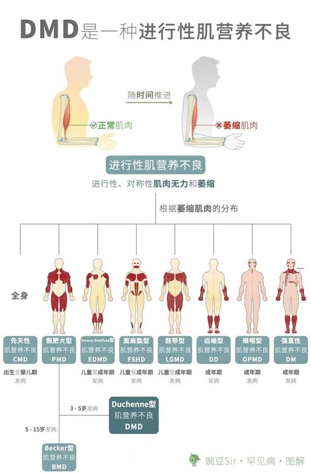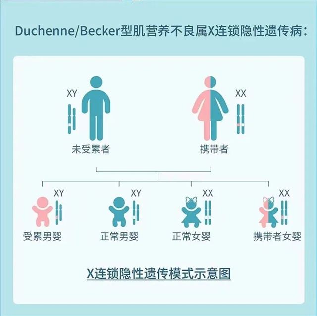 〈 科普引领·健康护航 〉 / DMD / 杜氏肌营养不良 ❖ 精准检测|规范诊疗|遗传咨询|健康护航 - 长治市妇幼保健院医学遗传科科普系列 - 每年的9月7日,是DMD全球知晓日,今年即将迎来第九个年头,其旨在让更多的人知道杜氏肌营养不良,让更多的人了解DMD患者的真实生活。关注DMD患儿,关注罕见病,请转发给更多的人。 01|什么是DMD? 肌营养不良是一组原发于肌肉组织的疾病,是由于遗传物质异常导致的进行性肌肉无力和肌肉萎缩,因此可遗传给后代。其中最为常见的类型为假肥大性肌营养不良,根据临床表现,又可分为Duchenne型肌营养不良(DMD)和Becker型肌营养不良(BMD)。DMD多发生于儿童时期,症状较严重,和BMD致病基因相同,但后者发病率仅约前者的1/10,且临床症状更轻,可青年甚至成年发病。因此临床上更多见的是DMD患者。 DMD/BMD多发生于男性,是常见的X连锁隐性遗传病。活产男婴中DMD的发病率约为1/3500,估算全国患者约70000人。 ❖ 02|遗传机制 DMD基因位于Xp21,跨度2300kb,是迄今为止发现的人类最大的基因。 由于致病基因位于X染色体上,是一种X连锁隐性遗传病,而男性只有一条X染色体,因此该基因若出现致病变异则可发病;女性因为有两条X染色体,一般只是致病变异的携带者。 备孕夫妻可能表型正常,但女性DMD基因致病突变携带者的后代中:男性有50%可能患病,50%可能正常;女性50%可能为携带者,50%可能不携带致病突变。 ❖ 03|临床表现 DMD患儿一般3-5岁开始出现临床表现,患儿常见表现包括学路晚,步态蹒跚、不能跑步、常无故摔倒等。 30%的患儿有不同程度的智力障碍; 约在12岁前丧失行走能力,20岁左右死于呼吸衰竭或心力衰竭; 动作笨拙,易跌倒,走路摇晃,登楼梯或者由坐、卧位起立困难; 患儿双侧腓肠肌逐渐呈假性肥大,腱反射减弱或消失; 近端肌无力可导致行走时呈特殊“鸭步”和爬行困难。 ❖ 04|DMD如何诊断? 为了明确诊断,可进行肌肉活检或基因检测。由于基因检测的无创性,一般作为首选的诊断手段;肌肉活检适用于基因检测结果阴性或临床分型不明确的患者,该方法直接定量检测肌肉细胞中抗肌营养不良蛋白,但属于有创操作。 ❖ 05|DMD如何预防? 遗憾的是,迄今为止DMD尚无有效的根治方法。但是及时的对症支持治疗和恰当的护理可以提高DMD患者的生活质量和延长寿命。此外,有效的预防至关重要。 ★对于DMD患者或者致病基因携带者以及生育过DMD患儿的家庭,应在孕前进行遗传咨询和生育指导,做相应的基因诊断及妊娠风险评估。在怀孕后也要尽早进行产前诊断,孕妈妈可在孕11周-13周+6天时,通过绒毛穿刺进行基因检测;或者在孕18周-22周+6天,通过羊水穿刺进行基因检测。 ★对于生育过DMD患儿的家庭,一定要尽早明确父母及患儿所携带的致病基因类型,在生育下一胎时也可以选择试管婴儿技术辅助受孕,即在胚胎植入母亲子宫前进行植入前诊断,筛选出其中未携带DMD基因的胚胎植入,确保胎儿健康。 ❖ 部分图文源于网络,侵权联系删除! 科室简介 长治市妇幼保健院医学遗传科,成立于1986年,目前拥有来自全国各地名校硕士研究生17人,高级职称3人。科室负责全市及周边地区遗传病咨询与诊疗、产前筛查与诊断、新生儿疾病筛查等工作。集实验检测、临床诊治随访、健康教育、技术培训与科研活动于一体的市级医学重点学科。 长治市妇幼保健院医学遗传科是山西第一批通过省卫计委验收的地级市产前诊断中心,主要负责全市及周边市区孕早、中、晚期产前筛查与诊断、遗传优生咨询及遗传病诊治。我们立足于现代医学的最前沿,为全省首家建立分子诊断平台的医疗机构,拥有荧光定量PCR-毛细管电泳(QF-PCR)、多重连接探针扩增(MLPA)、荧光原位杂交(FISH)、Sanger测序、高通量测序、染色体微阵列分析(SNP Array)、数字PCR等技术平台,可以满足针对不同临床症状的遗传性疾病进行检测与诊断。 往 期 精彩内容