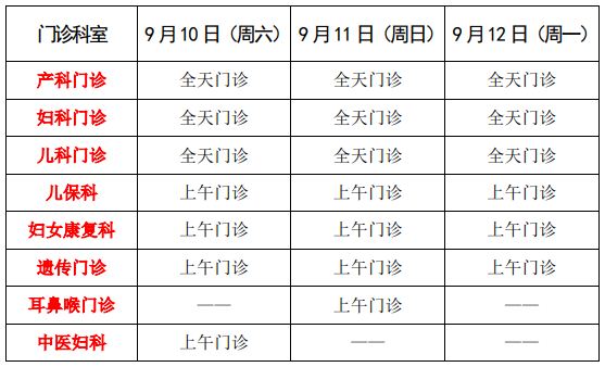 月圆中秋 但愿人长久,千里共婵娟 阴晴圆缺都休说, 且喜人间好时节。 好时节,愿得年年, 常见中秋月。 中秋节门诊安排早知道 尊敬的患者朋友: 长治市妇幼保健院实行非急诊全面预约挂号,请您通过关注“长治市妇幼保健院”公众号进行预约,全程佩戴口罩来院就诊。来院就诊患者及陪诊人员均需提供五日内核酸检测阴性证明;住院患者及陪侍人员,均需提供48小时内核酸检测阴性证明。 根据国家相关文件精神,今年中秋节放假时间为:9月10日(周六)至9月12日(周一),共三天。2022年9月13日(周二)正常上班,为方便广大患者就诊者,节假日期间核酸检测不休息,长治市妇幼保健院“中秋节”假期门诊正常开诊,具体安排如下: 1. 全天门诊: 儿内科门诊、产科门诊、妇科门诊及计划生育门诊全天开诊; 2. 上午门诊: 儿童保健科、妇女康复科和遗传咨询与产前诊断门诊每天上午开诊;中医妇科9月10日上午开诊;儿童耳鼻喉科门诊9月11日上午开诊; 3. 急诊24小时为您服务: 24小时热线电话:0355-2024068; 儿科急诊电话:0355-2119120; 妇产科急诊电话:0355-2051617。 4. 部分科室暂不出诊: “中秋节”假期期间儿童康复科、小儿外科、乳腺外科及中医儿科暂不出诊。 5. 温馨提示: 节假日期间,急诊请在挂号窗口现场挂号,挂急诊号到相关科室就诊,节日期间出诊以当日为准。 特别提醒 疫情防控不放松,就诊者须提前预约就诊时间,错峰就诊,全程佩戴口罩,保持安全社交距离,减少陪护,降低人群聚集感染风险。您可以通过以下方式预约挂号: 1. 微信预约:扫描微信公众“长治市妇幼保健院”、“近医通”、“支付宝”及“健康山西“二维码并关注,按照提示进行预约; 2. 自助预约:持“实名制就诊卡”在自助机上可进行预约挂号; 3. 诊间预约:医生可直接与就诊者预约下次复诊时间; 4. 窗口预约:在门诊大厅预约挂号窗口进行现场预约; 5. 出院预约:出院时可与主管医生直接预约复诊时间。 END 扫二维码|关注我们 供稿|门诊部 王雅芬 审核|党 办 李向东 编辑 | 宣传科 王慧丽