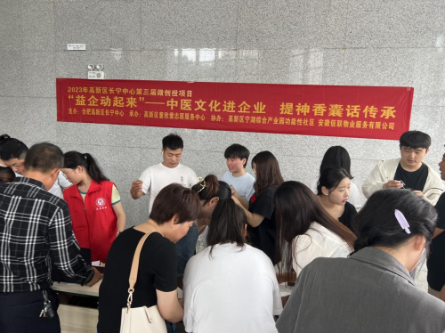 (凌雅棋 张霞 项五九)为传承和弘扬中医文化,促进社区和企业融合,深化多元服务,真正变组织力为发展力,近日,在安徽省合肥高新区宁湖综合产业园功能性社区筹备组、安徽信联物业服务有限公司的大力支持下,由合肥高新区童欣爱志愿服务中心承办的长宁中心第三届微创投项目“益企动起来”活动在创新置地广场一楼大厅开展。宁湖社区党支部书记姚维涛、高新区志愿服务联合会会长姬国印、安徽信联物业服务有限公司经理杨宏杰、润生社会工作服务中心主任叶小霞、高新区童欣爱志愿服务中心理事长周邵年等参加了本次活动。