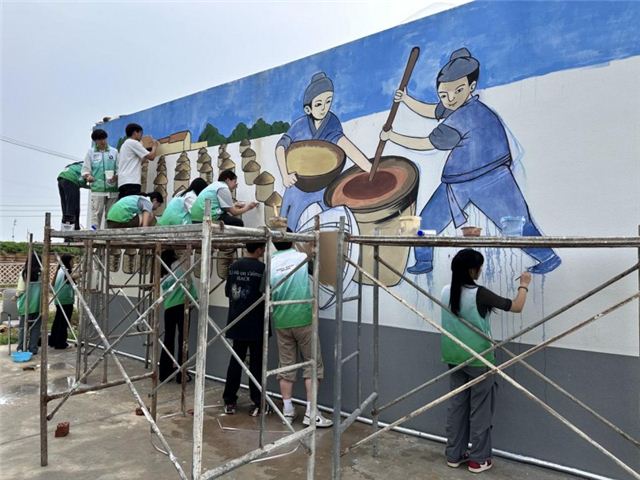 冶山街道有千年悠久历史,又是江苏省内重要的涉农街道,近年来大力发掘农民画、石柱林、冶山矿坑等文旅资源,不断擦亮诗画田园新底色。“青心筑梦冶山,童行助力振兴”社会实践队深度挖掘冶山街道村庄地域特点、文化特色、产业特质等素材,设计专属手稿,创作出“自然之馈·冶山酱香”“时光酝酿·冶山古酱”等具有显著冶山特色的主题墙绘,助力美丽乡村和宜居乡村建设,为农业农村现代化贡献青春力量。