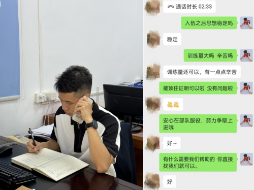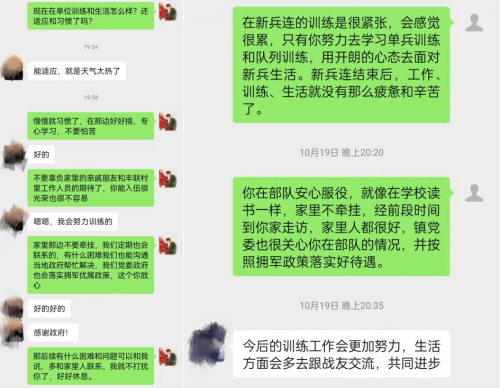 线上,武装部工作人员和各村(社区)定期通过电话、微信和视频等方式详细询问了新兵们在部队的生活与训练情况,关切询问遇到的疑难困惑、有针对性地做好新兵思想疏导和帮扶指导。同时向新兵们转达家乡人民的希望和嘱托,勉励新兵刻苦训练、听从指挥,要以优异成绩回报家乡人民的厚爱。新兵们积极回应,纷纷表示一定刻苦训练、努力学习,为家乡人民争光。
