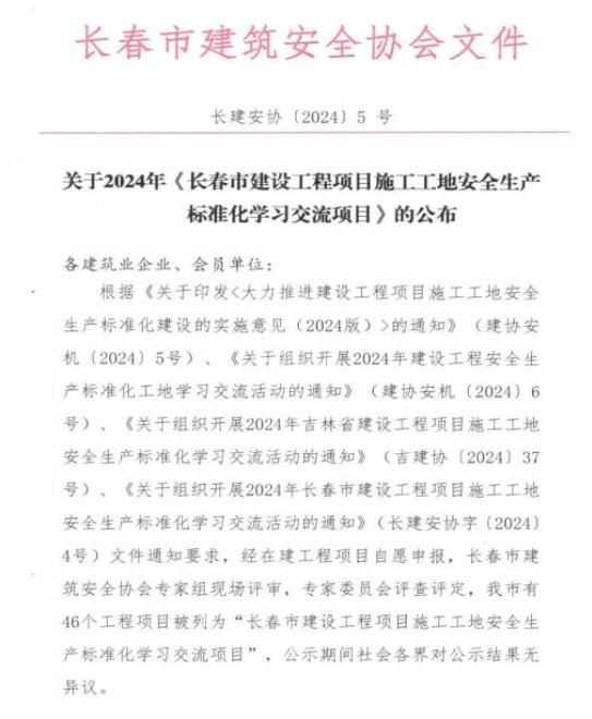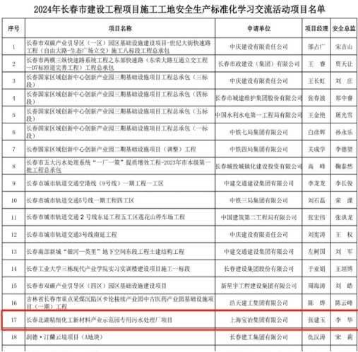 近日,长春市建筑安全协会发布了《关于2024年<长春市建设工程项目施工工地安全生产标准化学习交流项目>的公布》,上海宝冶长春分公司长春北湖精细化工新材料产业示范园项目名列其中。