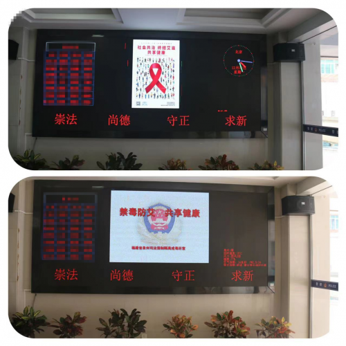 泉州司法强戒所在机关楼大厅的LED大屏幕上滚动播放预防艾滋相关内容的视频。这些视频通过生动的画面、真实的案例和专业的讲解,向全体民警职工和来访人员宣传艾滋病的危害、传播途径以及预防措施。通过这种直观的宣传方式,营造了浓厚的防艾氛围,提醒大家时刻关注艾滋病问题,积极参与防艾行动。