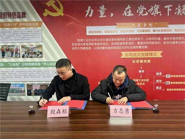 金融与经贸学院党总支书记方志勇和海宁钱塘工业社区党总支书记殷森标共同签署了党建联建协议书。