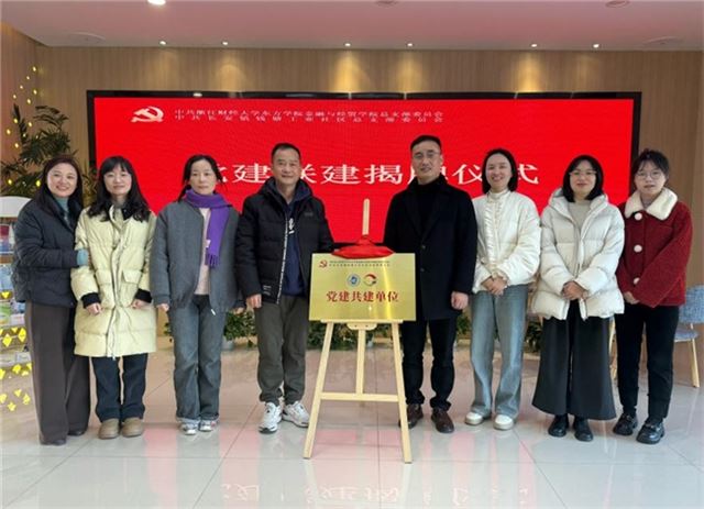 金融与经贸学院总支书记方志勇和海宁钱塘工业社区党总支书记殷森标共同为党建联建单位揭牌。