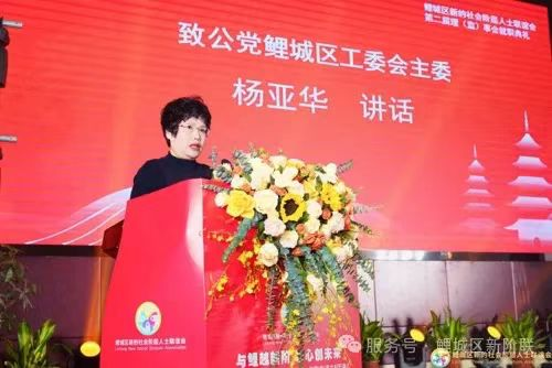 致公党鲤城区工委会主委杨亚华代表鲤城区各民主党派及兄弟单位上台致辞,她对鲤城区新联会换届表示热烈祝贺,并强调了新联会在凝聚各方力量、推动区域发展中的重要作用,同时表达了对未来加强合作交流的殷切期望。