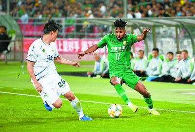 国安球员巴坎布(右)在比赛中带球突破。本报记者 和冠欣摄