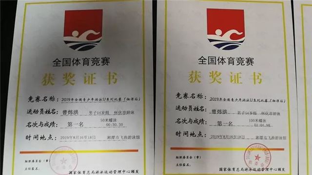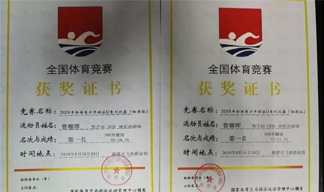 在8月18日落幕的2019年全国青少年游泳U系列比赛中,该市派出4名运动员参赛,共获得4枚金牌。其中,曾炜洪在男子14岁组比赛中分别夺得男子50米仰泳、100米蝶泳两个项目桂冠;曾柳珲在男子16-18岁组男子100米蝶泳、200米蝶泳两个项目比赛中折桂,并以2分11秒14的优异成绩创造了200米蝶泳新的赛会纪录。