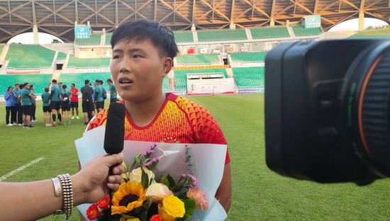 中国女子橄榄球队队长闫美玲接受媒体采访